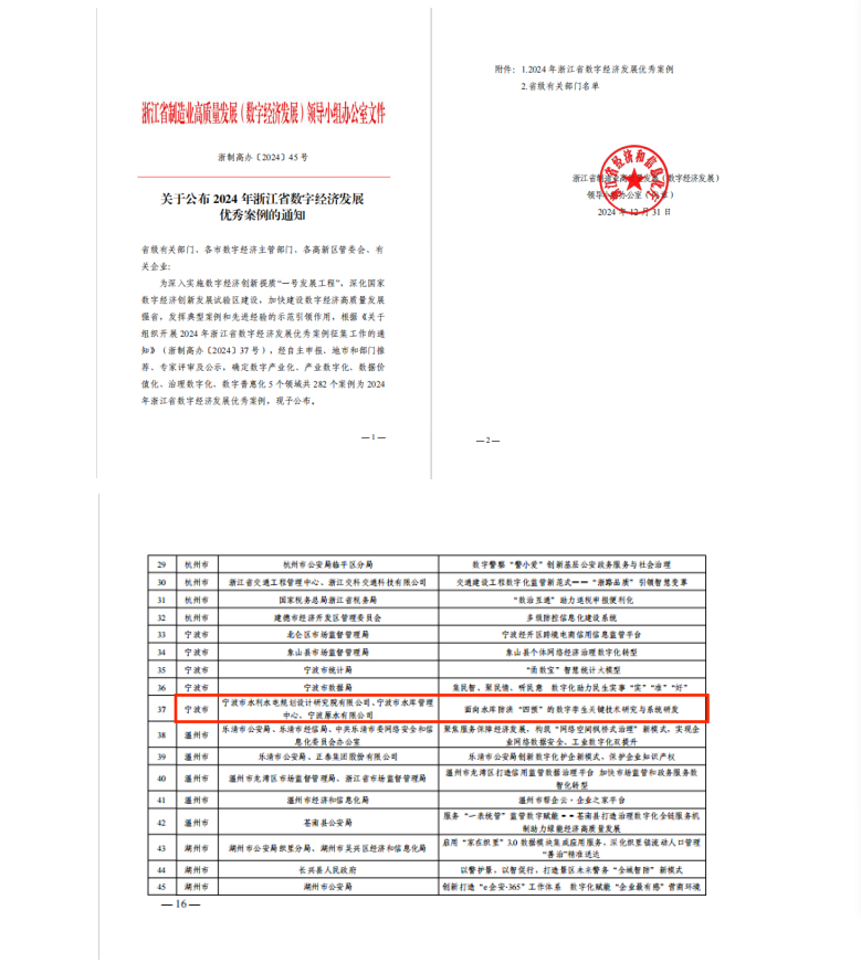 近日,浙江省經(jīng)濟(jì)和信息化廳發(fā)布《2024年浙江省數(shù)字經(jīng)濟(jì)優(yōu)秀案例擬確定名單》并完成公示,我院與寧波市水庫管理中心、寧波原水有限公司聯(lián)合申報(bào)的“面向水庫防洪‘四預(yù)’的數(shù)字孿生關(guān)鍵技術(shù)研究與系統(tǒng)研發(fā)”案例成功入選。