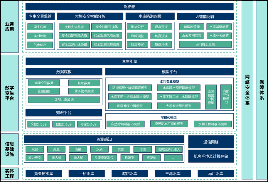 《方案》以黃栗樹等五座水庫為核心對象,進(jìn)行了前瞻性的信息化總體設(shè)計。旨在通過引入先進(jìn)信息技術(shù),構(gòu)建覆蓋水庫運(yùn)行管理全生命周期的智能化體系。該體系以實(shí)現(xiàn)對水雨情、工情、供用水、水質(zhì)及安全狀況等關(guān)鍵要素的精準(zhǔn)感知、動態(tài)監(jiān)測、智能分析與高效決策為核心目標(biāo),全面提升水庫在科學(xué)調(diào)度、風(fēng)險防控、管理效能與服務(wù)保障方面的綜合能力。主要建設(shè)內(nèi)容涵蓋智慧業(yè)務(wù)應(yīng)用、數(shù)字孿生平臺、信息基礎(chǔ)設(shè)施及網(wǎng)絡(luò)安全體系,共同構(gòu)成層次清晰、協(xié)同聯(lián)動、安全可靠的現(xiàn)代化水利信息化總體框架,為區(qū)域水安全與可持續(xù)發(fā)展奠定堅實(shí)的數(shù)字基石。