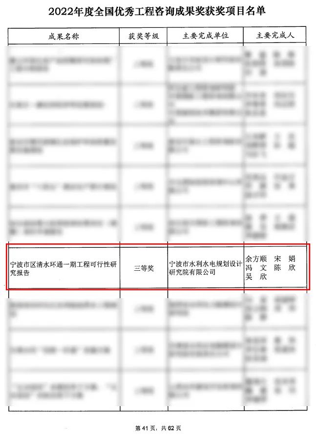 近日,中國(guó)工程咨詢協(xié)會(huì)公布2022年度全國(guó)優(yōu)秀工程咨詢成果獎(jiǎng)獲獎(jiǎng)項(xiàng)目名單,寧波市水利院申報(bào)的《寧波市區(qū)清水環(huán)通一期工程可行性研究報(bào)告》咨詢成果順利通過(guò)公示,榮獲2022年度全國(guó)優(yōu)秀工程咨詢成果三等獎(jiǎng)!該獎(jiǎng)項(xiàng)由中國(guó)咨詢工程協(xié)會(huì)組織申報(bào)評(píng)審,每?jī)赡暝u(píng)選一次,是中國(guó)工程咨詢行業(yè)含金量最高的獎(jiǎng)項(xiàng)。
