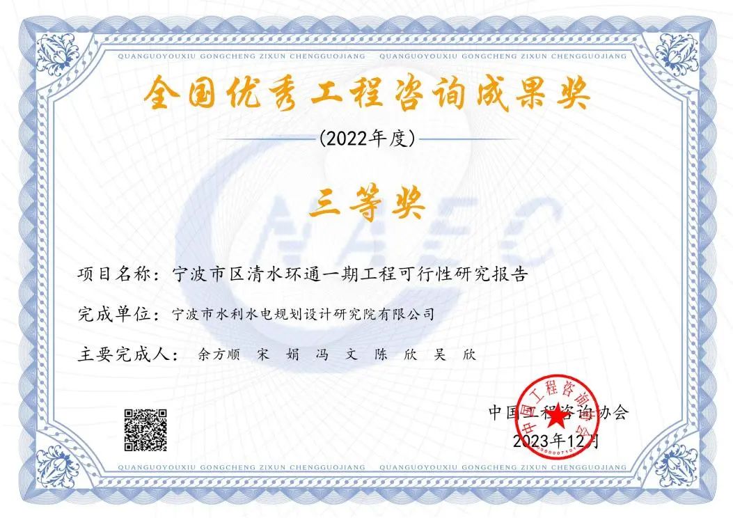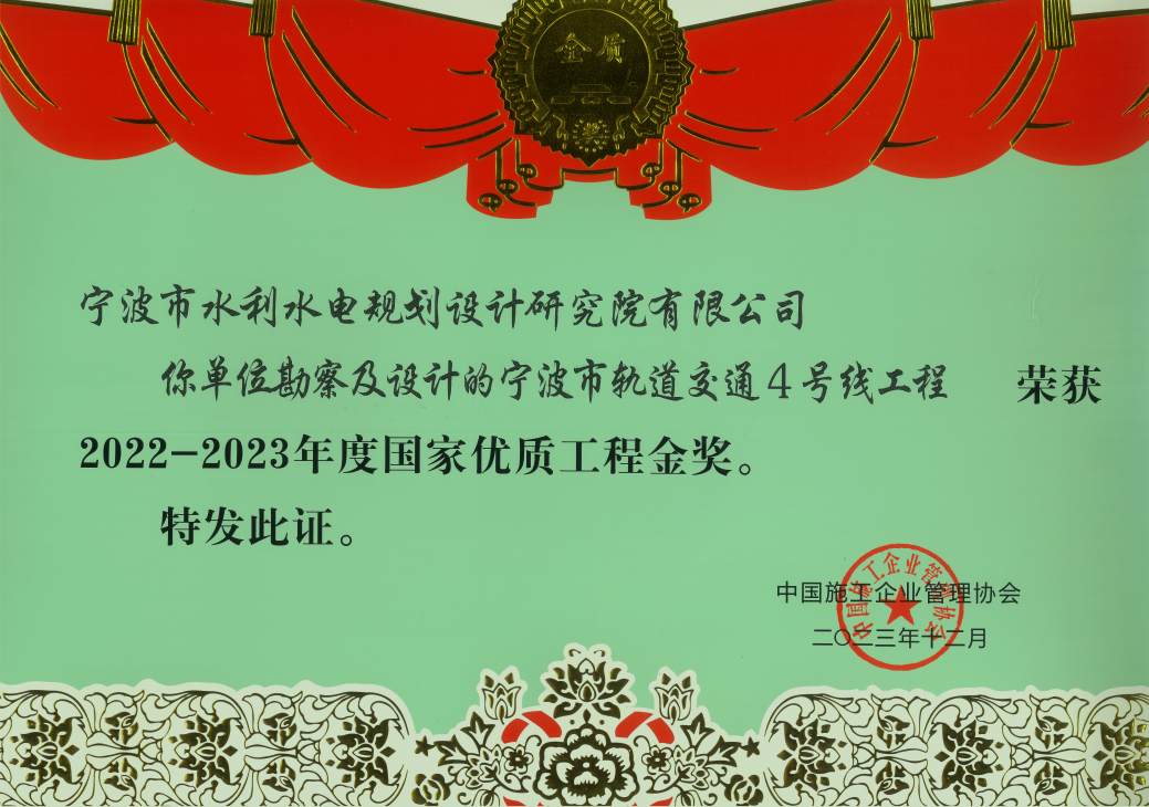 2023年我院多個(gè)項(xiàng)目在各類評(píng)比中脫穎而出,榮獲中國(guó)水利工程優(yōu)質(zhì)(大禹)獎(jiǎng)、國(guó)家優(yōu)質(zhì)工程金獎(jiǎng)、全國(guó)優(yōu)秀工程咨詢成果三等獎(jiǎng)、浙江省水利科技創(chuàng)新獎(jiǎng)、浙江省水土保持學(xué)會(huì)第三屆優(yōu)秀設(shè)計(jì)三等獎(jiǎng)、“浙江省文明標(biāo)化工地”稱號(hào)、2023 年度寧波市建設(shè)工程優(yōu)秀勘察設(shè)計(jì)獎(jiǎng)、2023年度寧波市“甬江建設(shè)杯”優(yōu)質(zhì)工程獎(jiǎng)、寧波市水利科技創(chuàng)新獎(jiǎng)、寧波市水利學(xué)會(huì)優(yōu)秀論文獎(jiǎng)等各類榮譽(yù)20余項(xiàng)。
